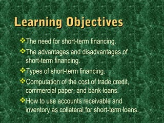 Require pymt in short term. Financing through accounts receivable can be done either by pledging the receivables or by selling them outright a process called factoring in the United States. Short-Term Financing is a way of meeting the financial requirements of the companies for a short period ie 15 days to 1 yearThese finances are generally used for making daily expenses purchasing material and paying tax.